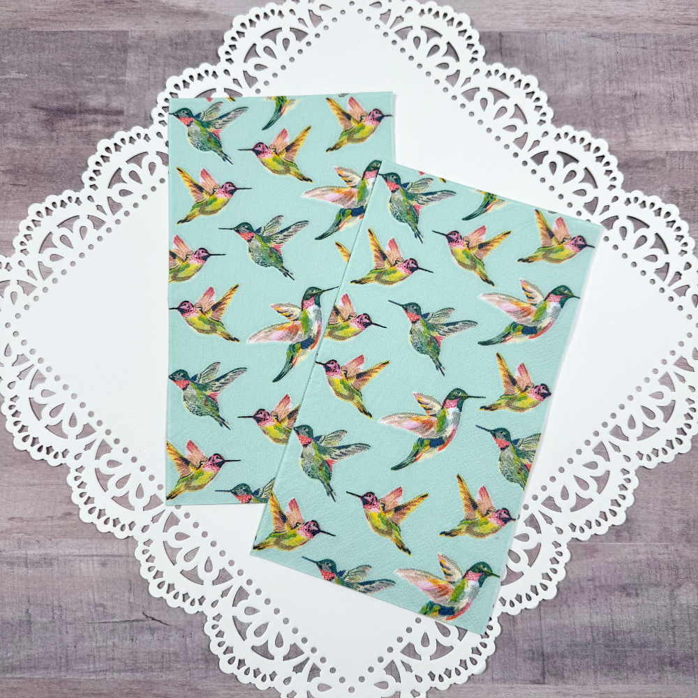 Beautiful decoupage napkins with a repeating pattern of flying hummingbirds against a teal background.