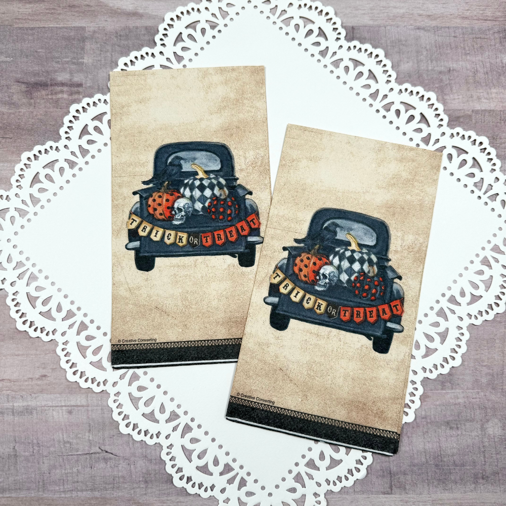 Not-so-scary decoupage napkins with a truck load of pumpkins and Halloween trick-or-treat banner. The napkin background has an aged, vintage look to it which makes it perfect for blending with all your favorite paints!